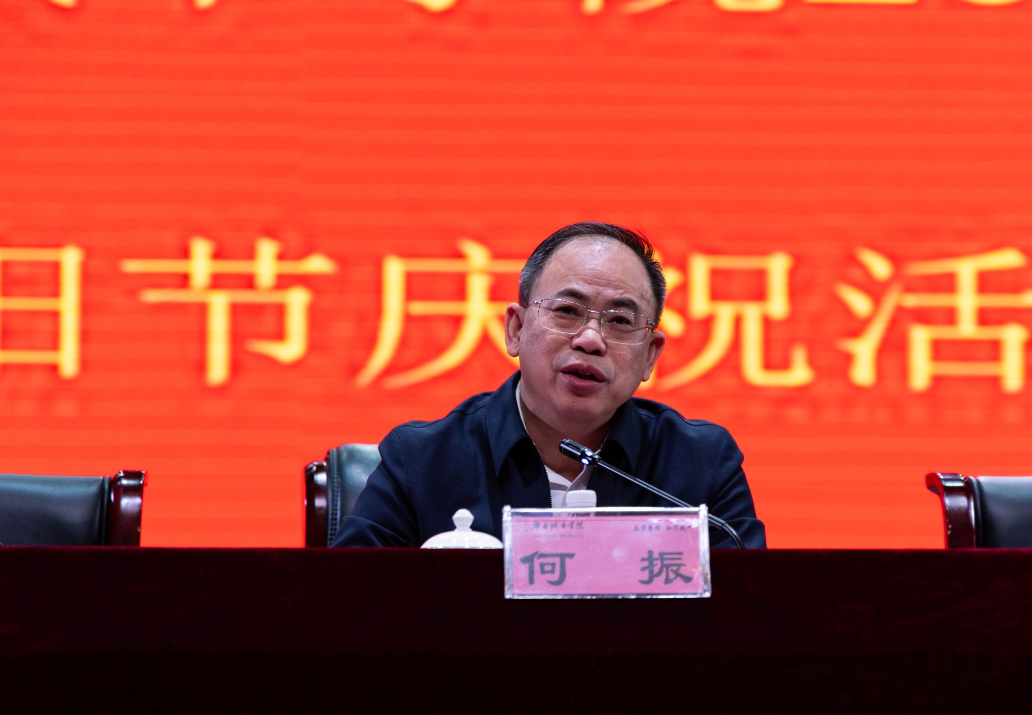 活动在庄严的国歌声中拉开序幕。何振代表学校党委行政向各位老同志致以节日的问候和祝福,向受表彰的先进个人,八十大寿、九十大寿的寿星,金婚、钻石婚夫妇致以崇高的敬意。何振简要介绍了今年学校在教育教学、科学研究、人才培养、社会服务和离退休工作等方面取得的优异成绩,对老同志们为学校建设发展贡献的智慧力量、倾注的辛勤汗水表示衷心的感谢。
